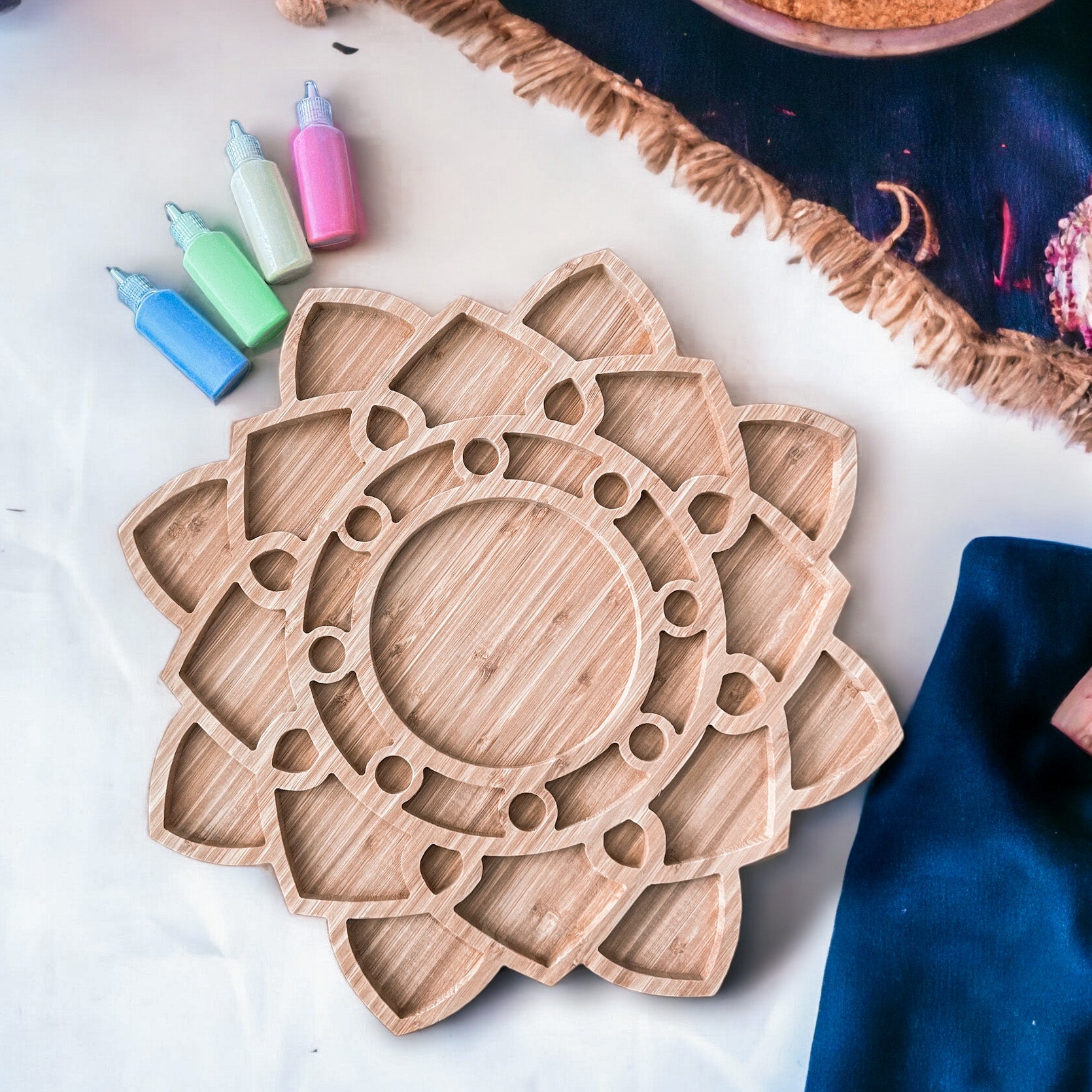 6. Perfect Gift: Looking for a unique and thoughtful gift for your loved ones? Our wooden Rangoli tray is an ideal choice. Whether it's for a housewarming, wedding, or any festive occasion, this eco-friendly tray will surely impress and leave a lasting impression.