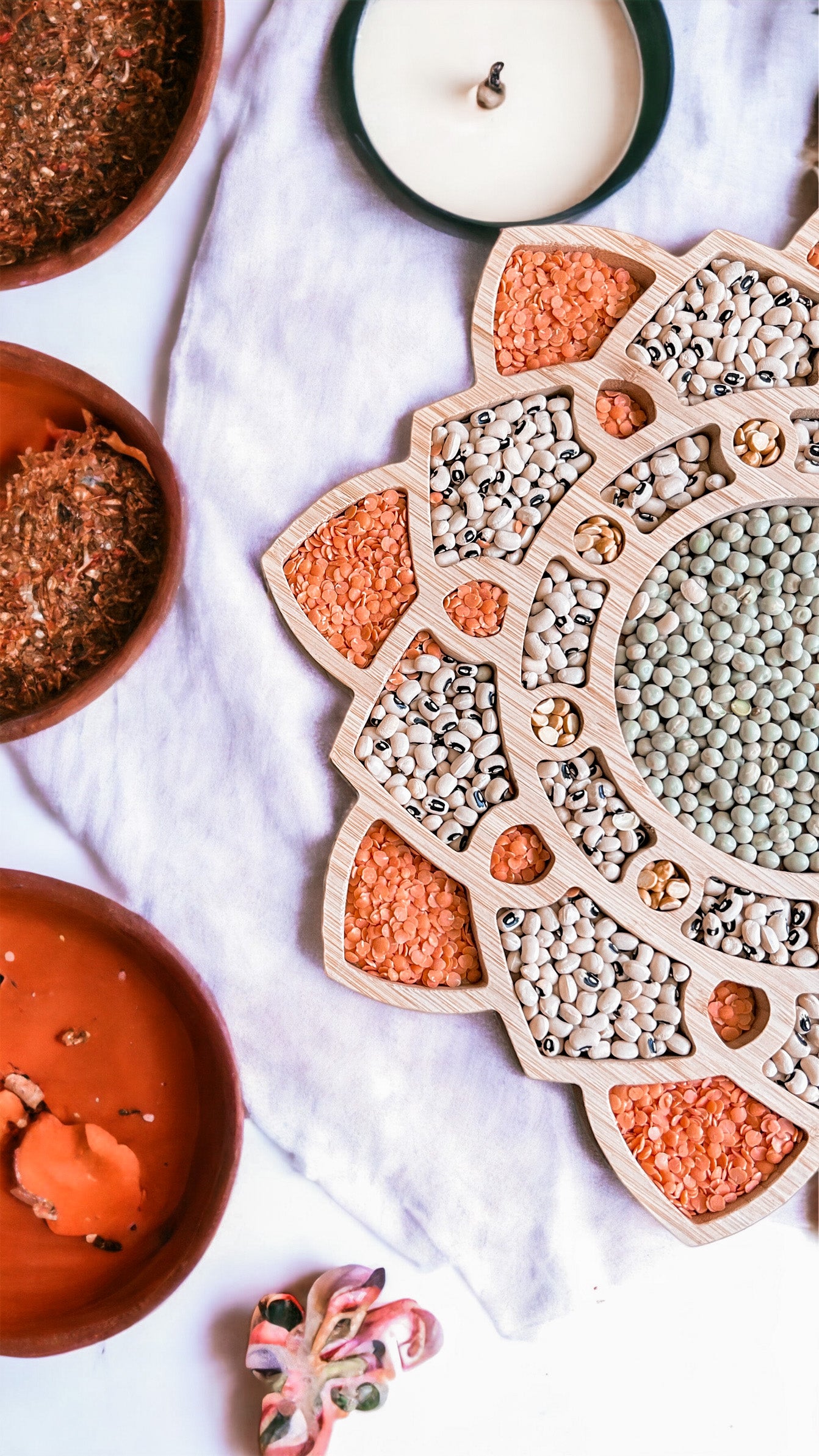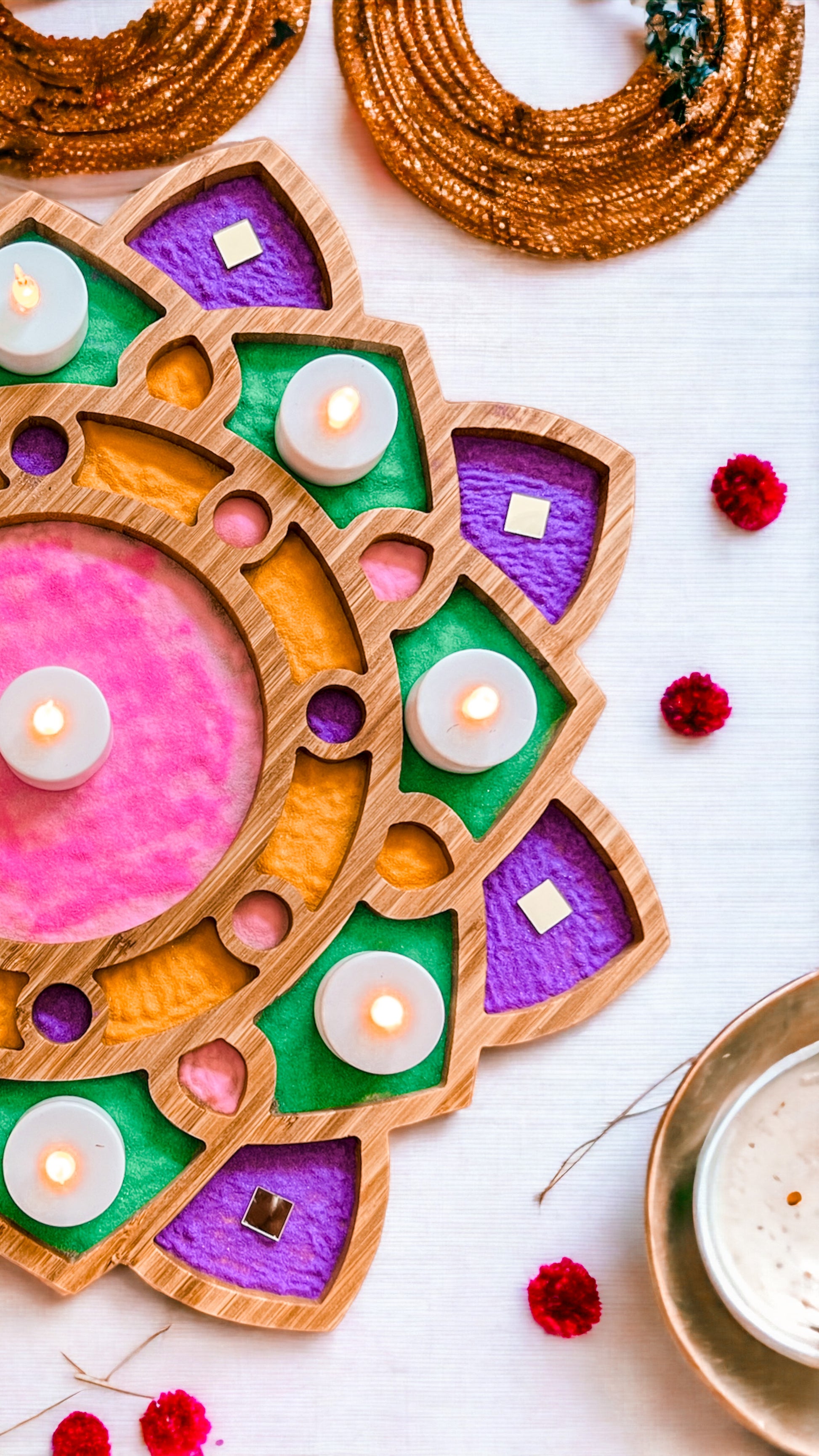 4. Versatile: Our wooden Rangoli tray is designed to accommodate various decorative elements such as flowers, candles, lentils, nuts or colored rice. Let your creativity flow and customize your Rangoli design to suit your personal style and preferences.