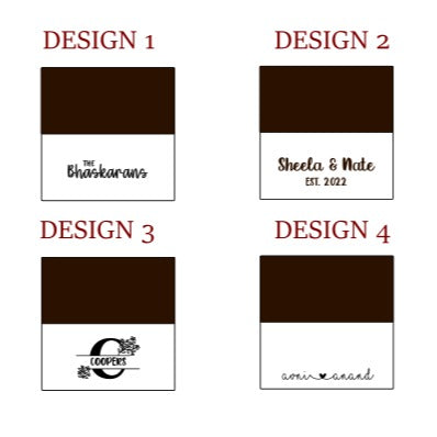 Our personalized coasters make a perfect gift for Bridal Showers, Weddings, Birthdays, Christmas, Housewarming, Diwali, Anniversaries or just about any occasion. They can be made in 4 different designs, or even a custom one! Just shoot us a message and we will make it happen. This special gift will commemorate a special event in the lives of your family and friends.